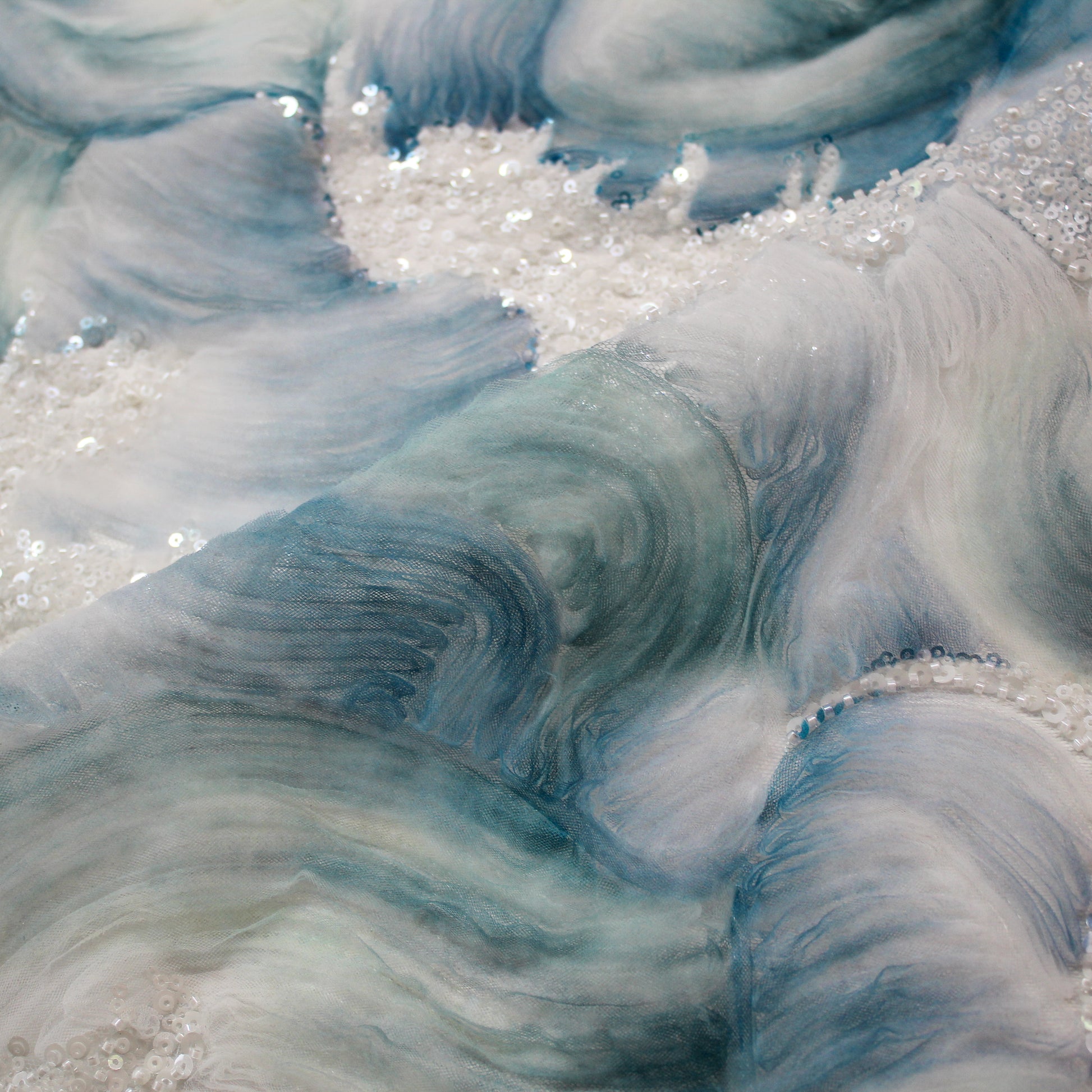 Tulle Ricamato con Motivo ad Onde, Tulle, Paillettes e Coralli