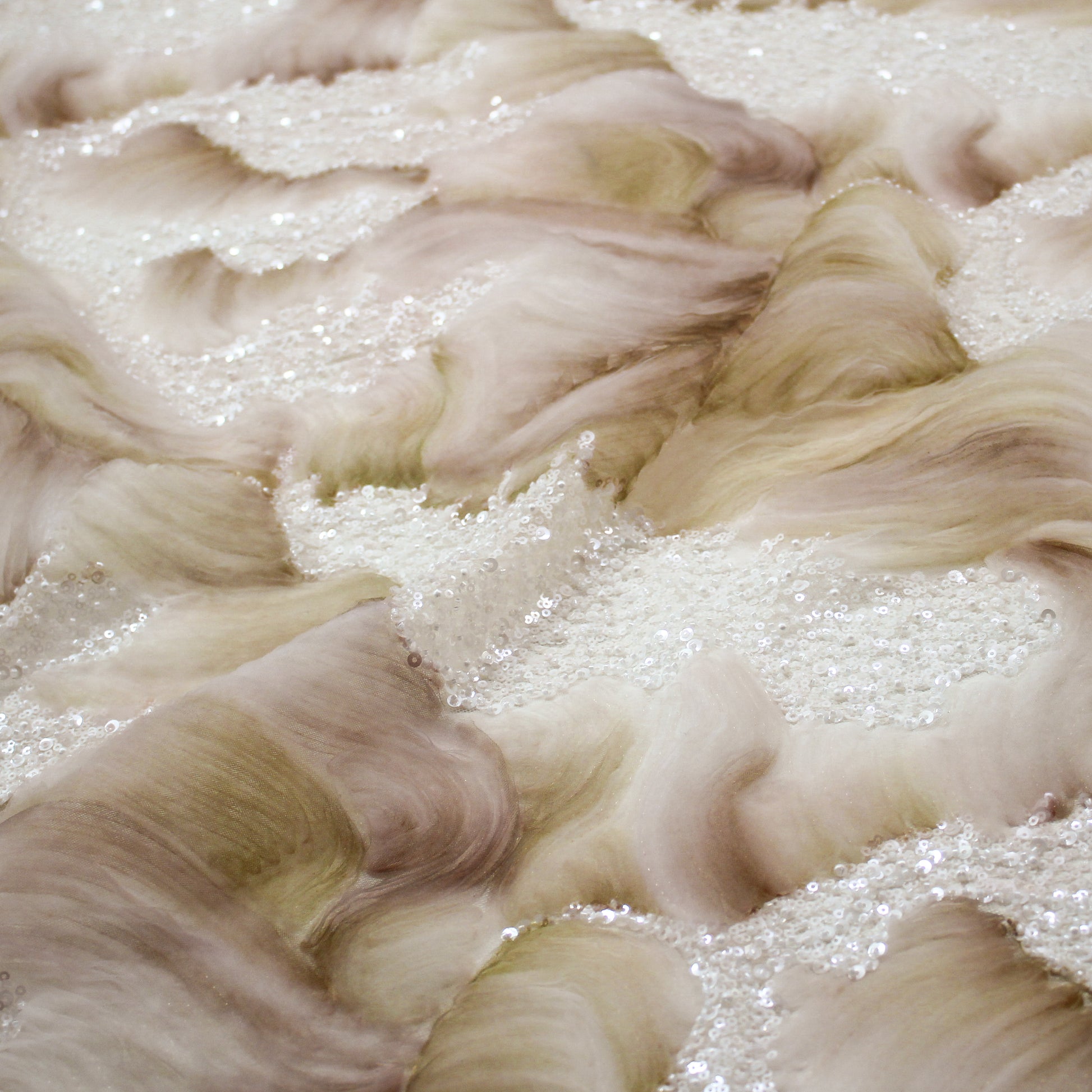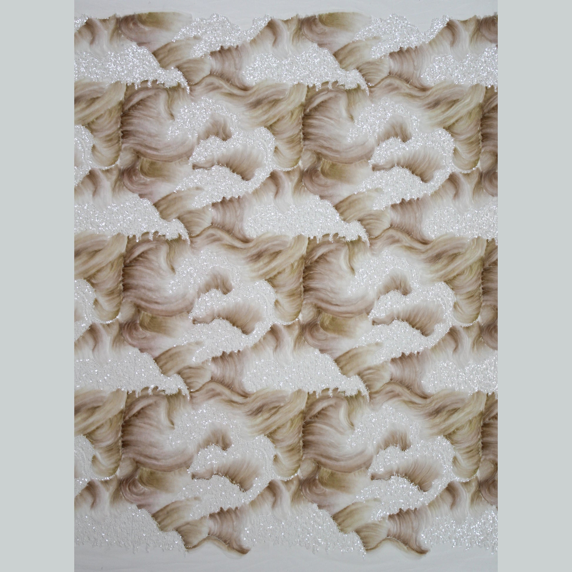 Un tulle ricamato di grande impatto visivo, caratterizzato da un sinuoso motivo ad onde impreziosito da paillettes luminose e applicazioni di coralli. Il ritmo fluido del disegno dona movimento e profondità alla superficie, mentre i dettagli decorativi catturano la luce con raffinata eleganza. Ideale per abiti da cerimonia, creazioni haute couture e capi esclusivi, questo tessuto esprime un perfetto equilibrio tra leggerezza e ricchezza ornamentale. Perfetto per chi desidera un materiale di lusso dal carattere distintivo e contemporaneo.