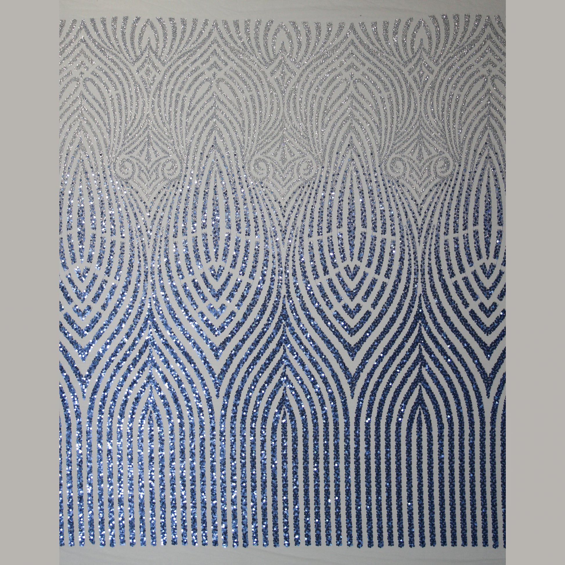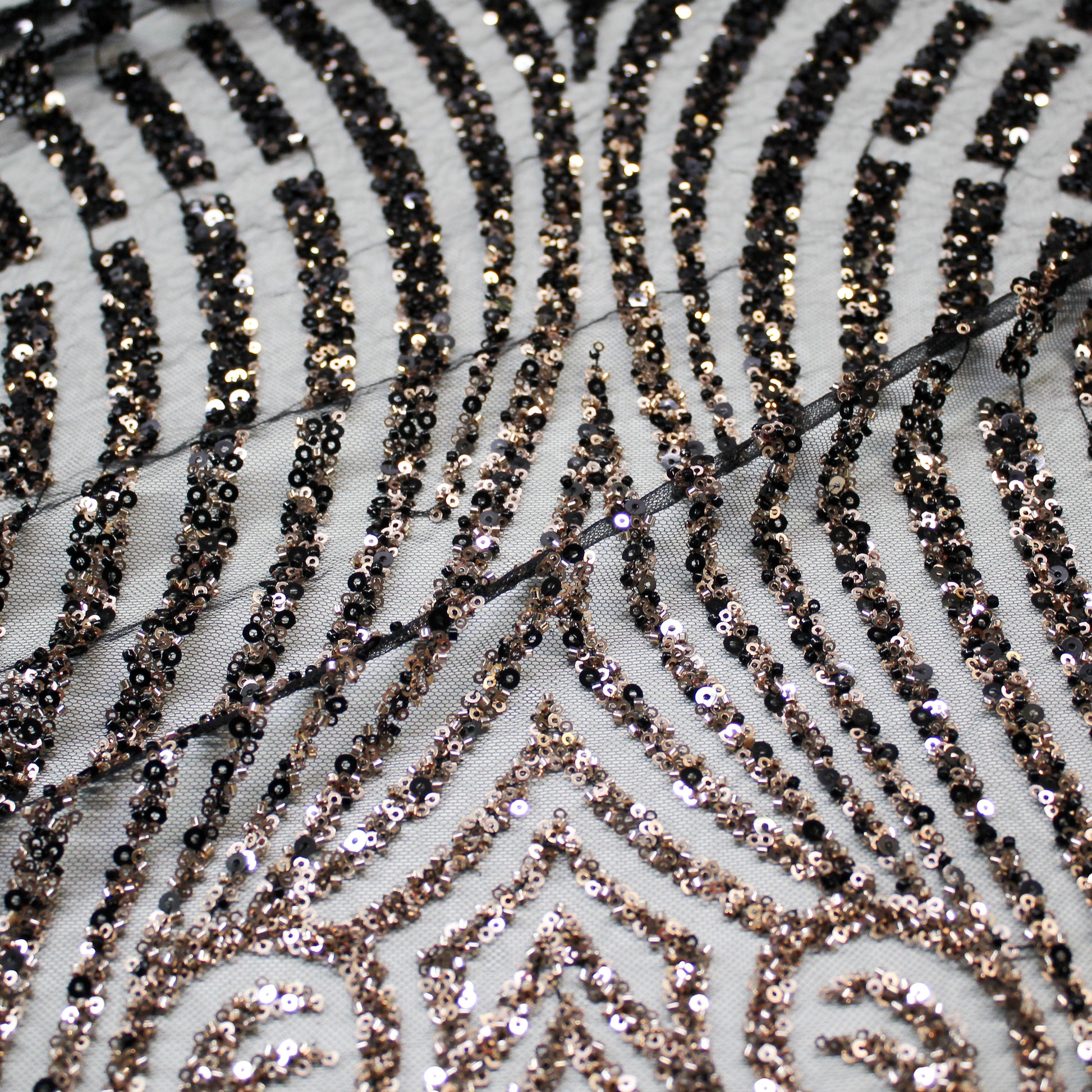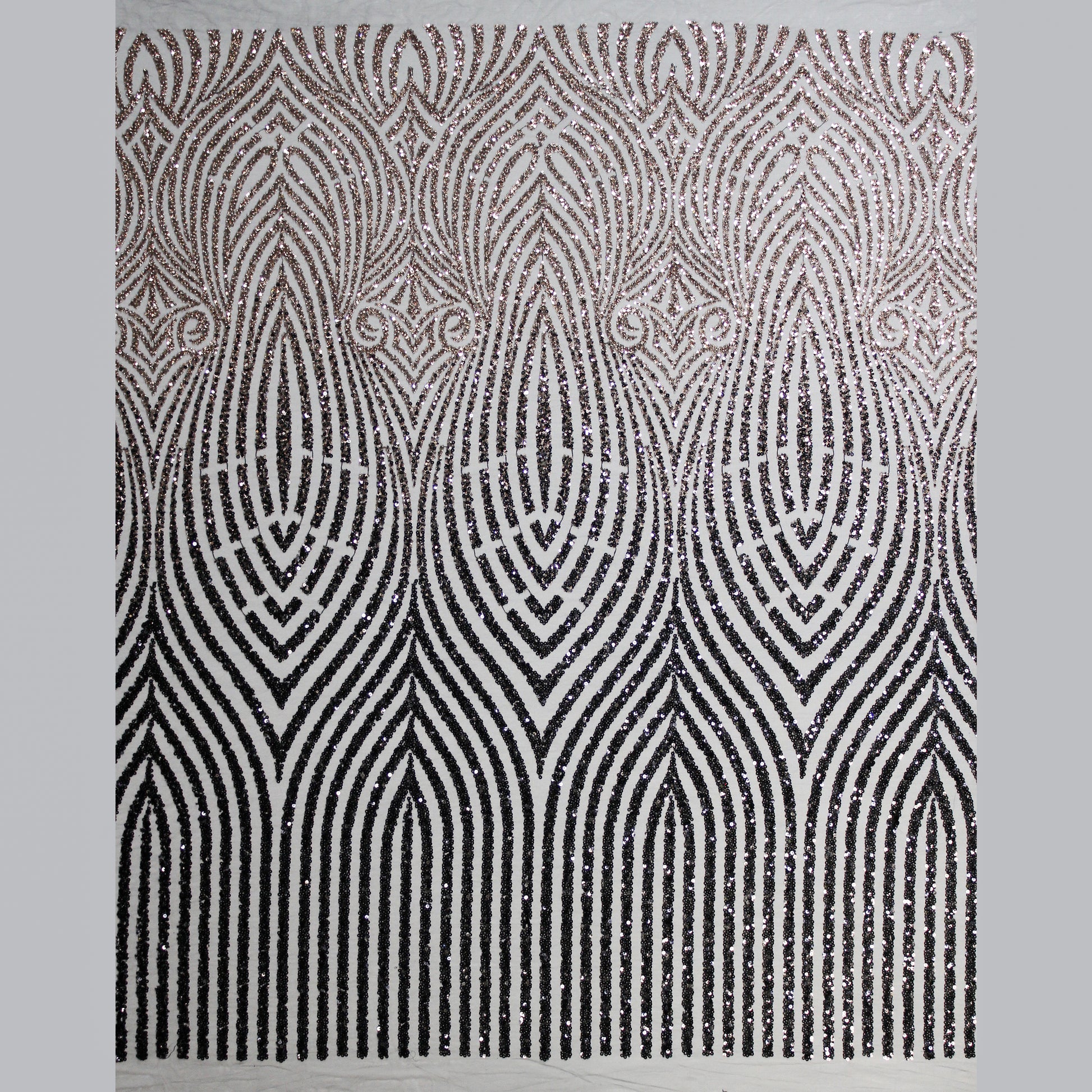 Un tulle ricamato di grande raffinatezza, impreziosito da paillettes luminose e coralli applicati che disegnano un raffinato motivo arabesco. L’equilibrio tra trasparenze leggere e dettagli decorativi crea un effetto scenografico e ricco di movimento, capace di catturare la luce con eleganza. Ideale per abiti da cerimonia, creazioni haute couture e capi esclusivi, questo tessuto esprime un perfetto connubio tra artigianalità preziosa e gusto ornamentale sofisticato. Perfetto per chi desidera un materiale di lusso dal forte impatto visivo e dal fascino senza tempo.