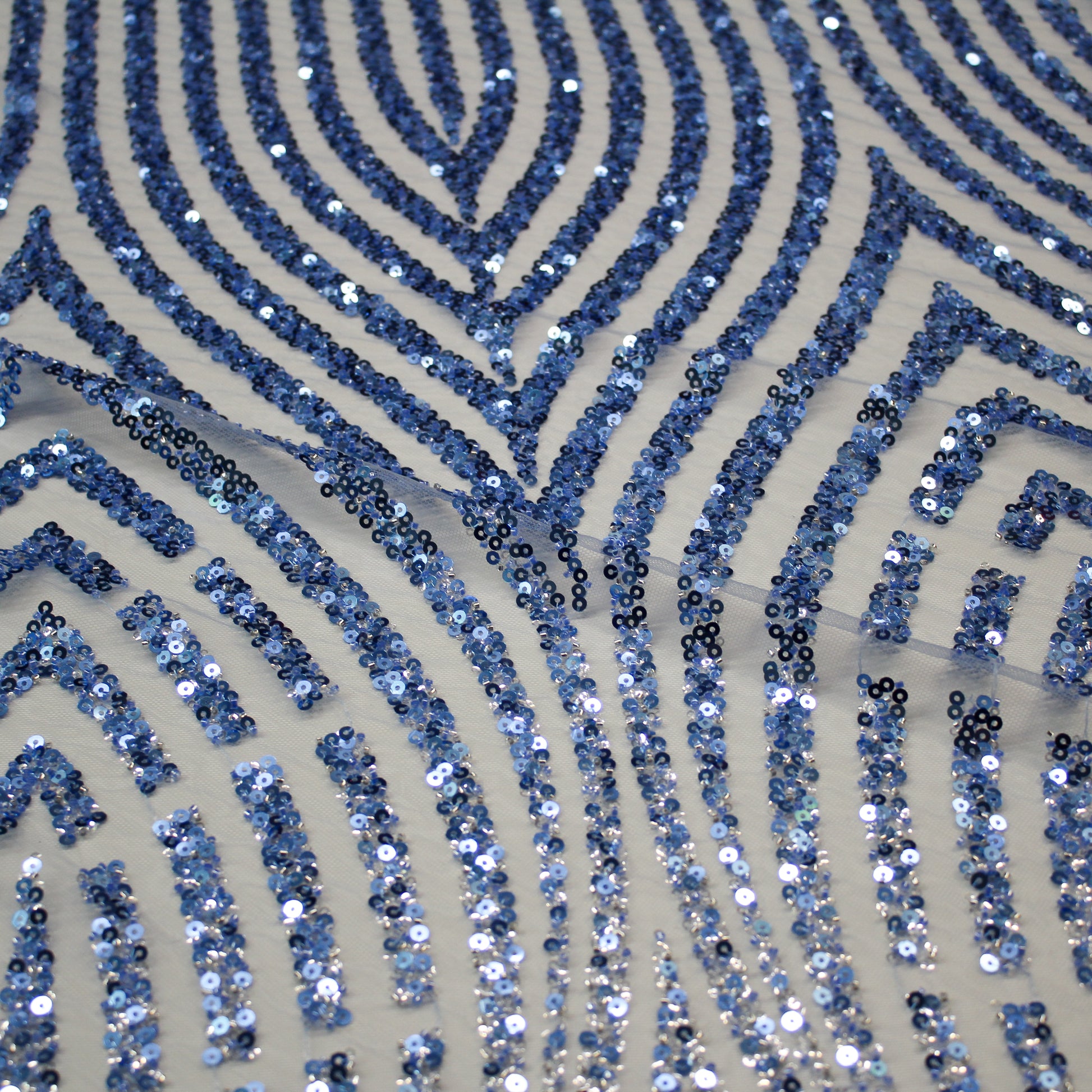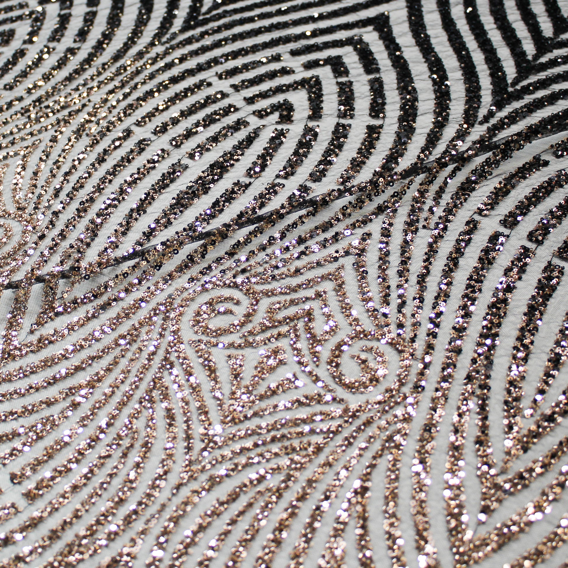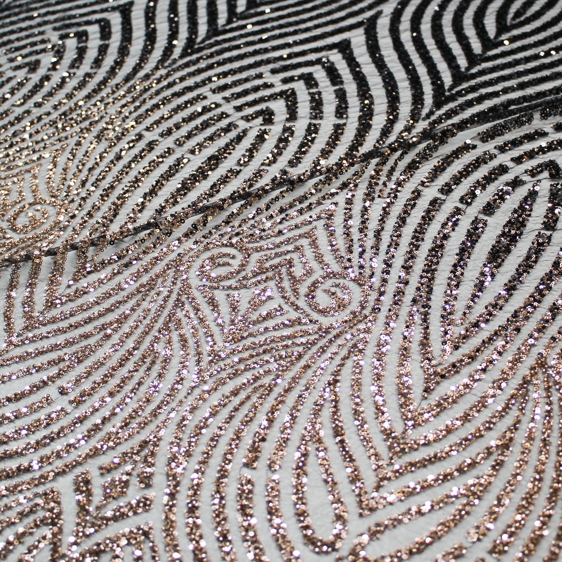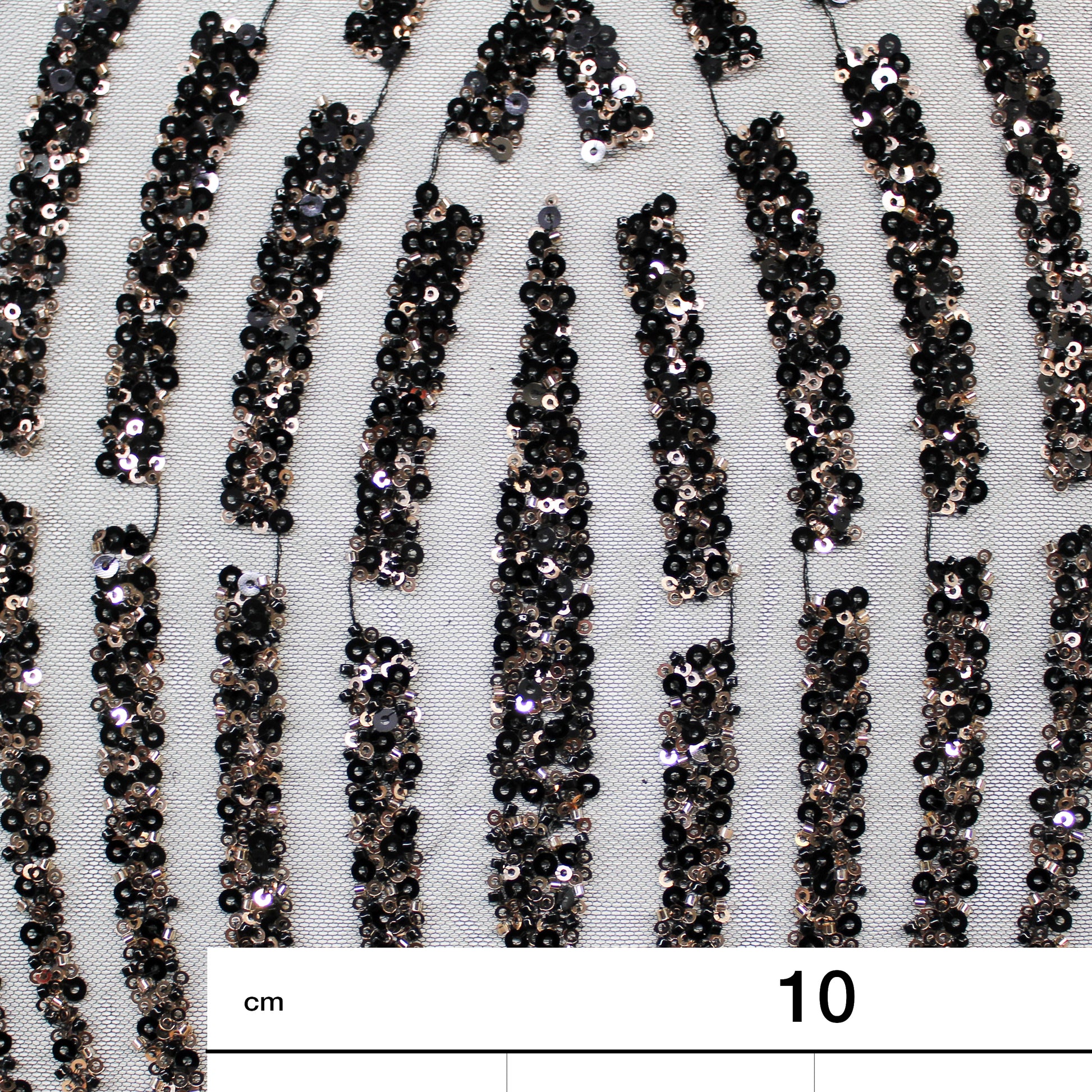Un tulle ricamato di grande raffinatezza, impreziosito da paillettes luminose e coralli applicati che disegnano un raffinato motivo arabesco. L’equilibrio tra trasparenze leggere e dettagli decorativi crea un effetto scenografico e ricco di movimento, capace di catturare la luce con eleganza. Ideale per abiti da cerimonia, creazioni haute couture e capi esclusivi, questo tessuto esprime un perfetto connubio tra artigianalità preziosa e gusto ornamentale sofisticato. Perfetto per chi desidera un materiale di lusso dal forte impatto visivo e dal fascino senza tempo.